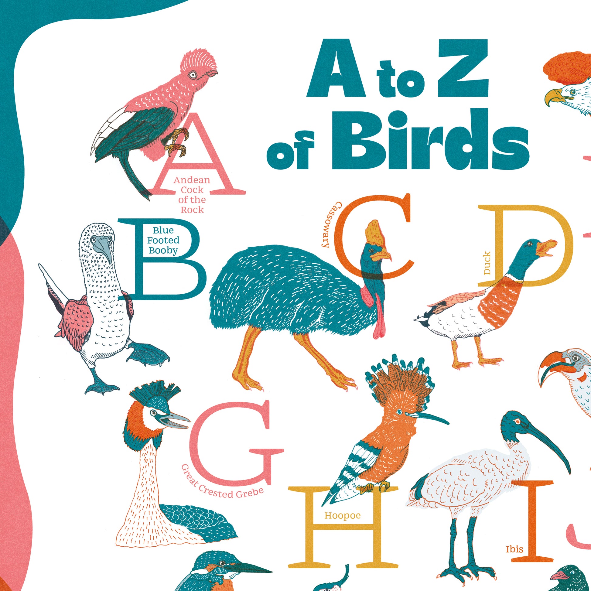 Discover the wonderful world of birds with this hand-drawn alphabet print, perfect for curious minds and nature lovers alike. Each letter of the alphabet is paired with a carefully illustrated bird, from the majestic Andean Condor to the graceful Hoopoe.