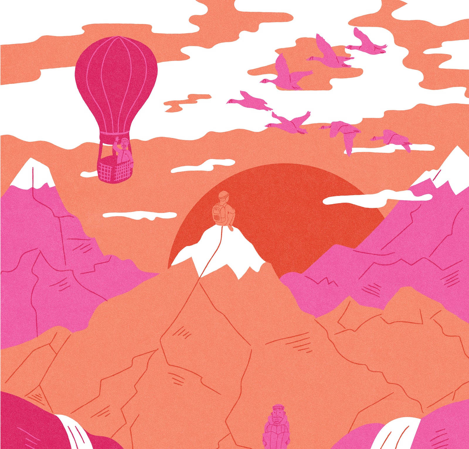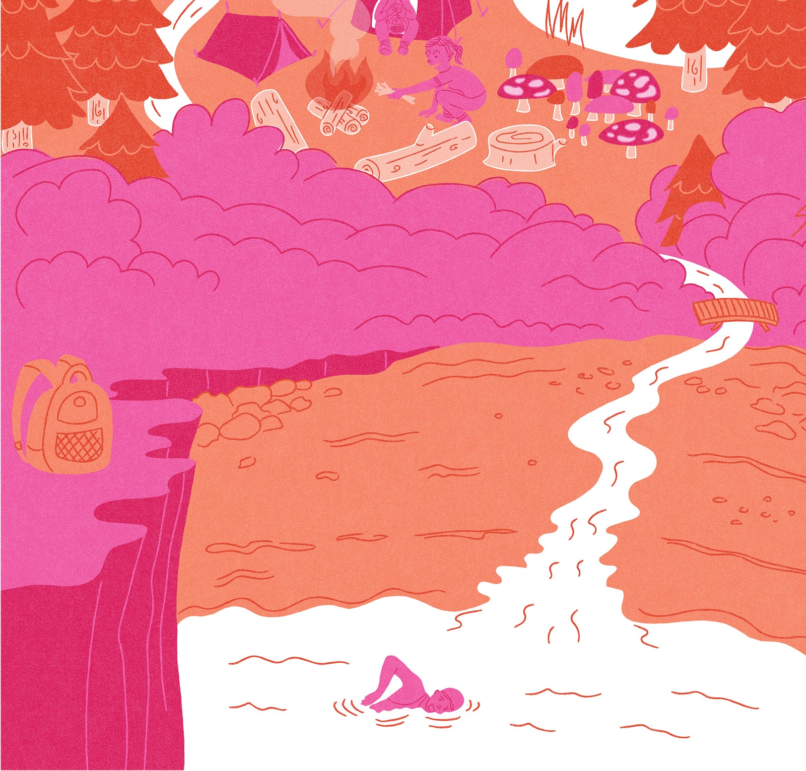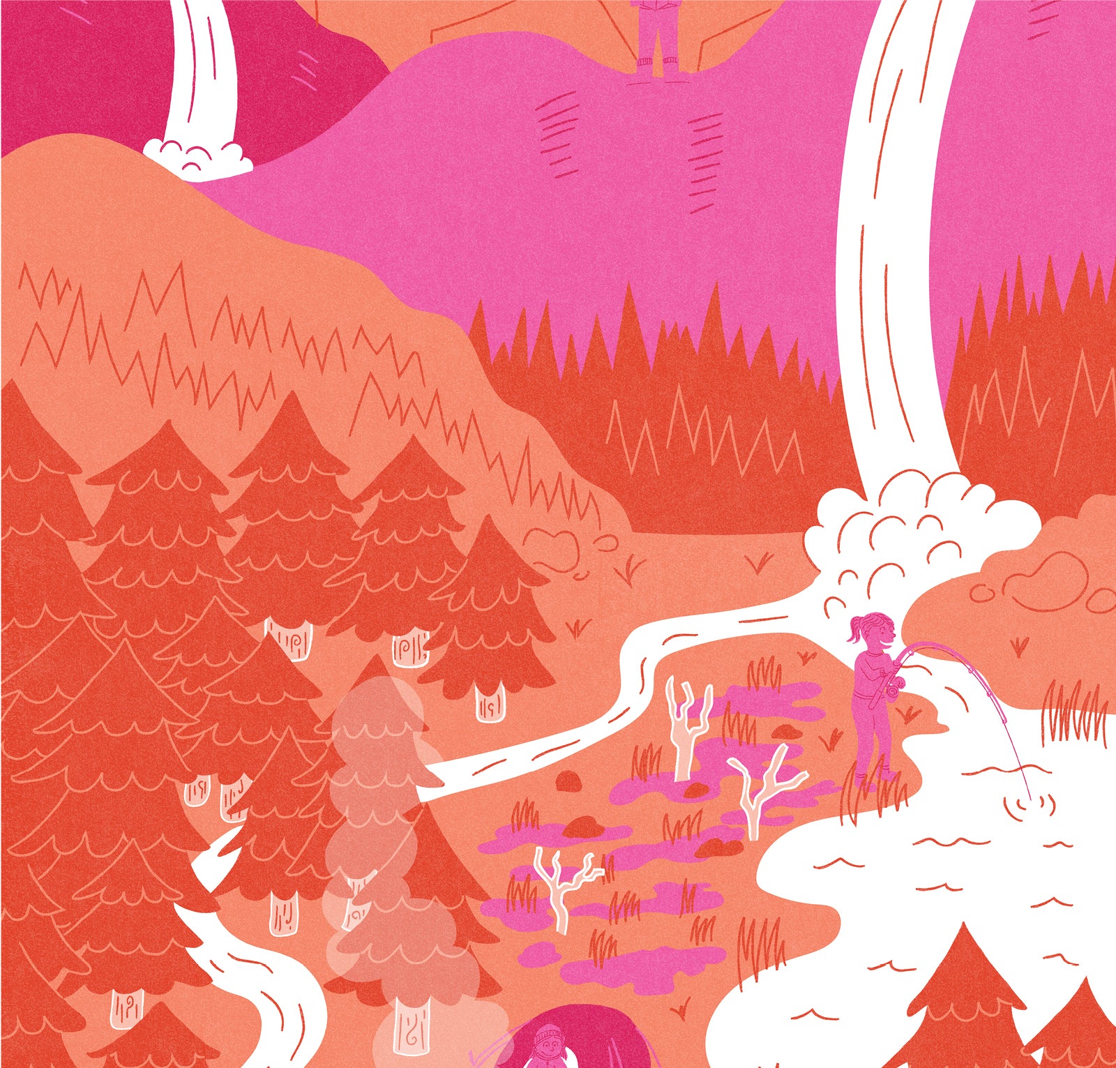 A vertical expedition through the wilderness – digitally illustrated with textured risograph style charm