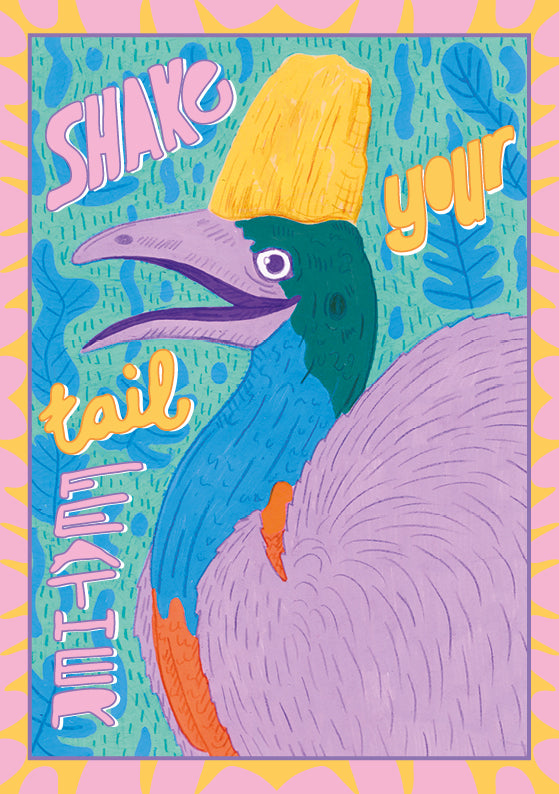 Phyllis the Cassowary 'Shake Your Tail Feather' Greetings Card – bringing the party wherever it goes