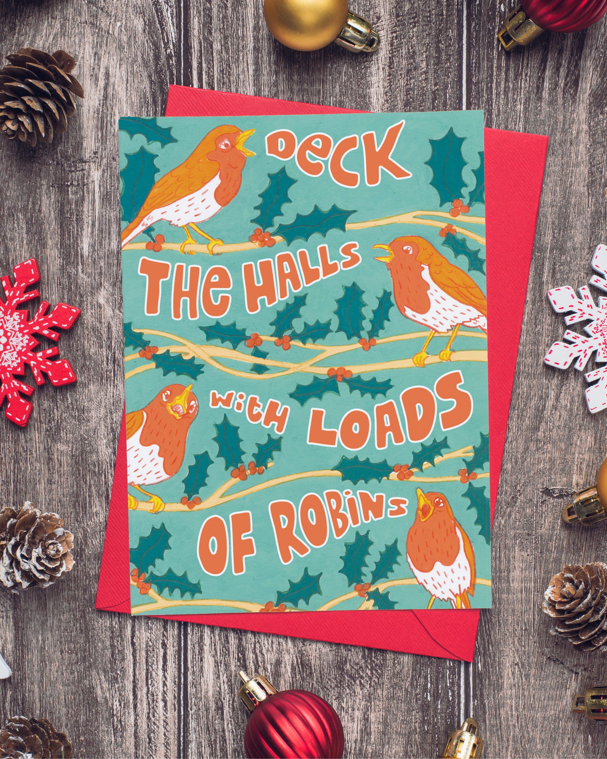 Singing Robins 'Deck the Halls with Loads of Robins' Christmas Card – a festive twist on a classic